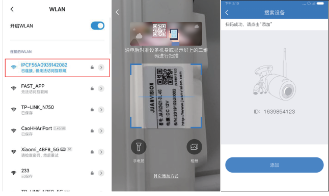 2.打开APP,进入扫码界面扫描设备机身上的二维码,点击“添加”;